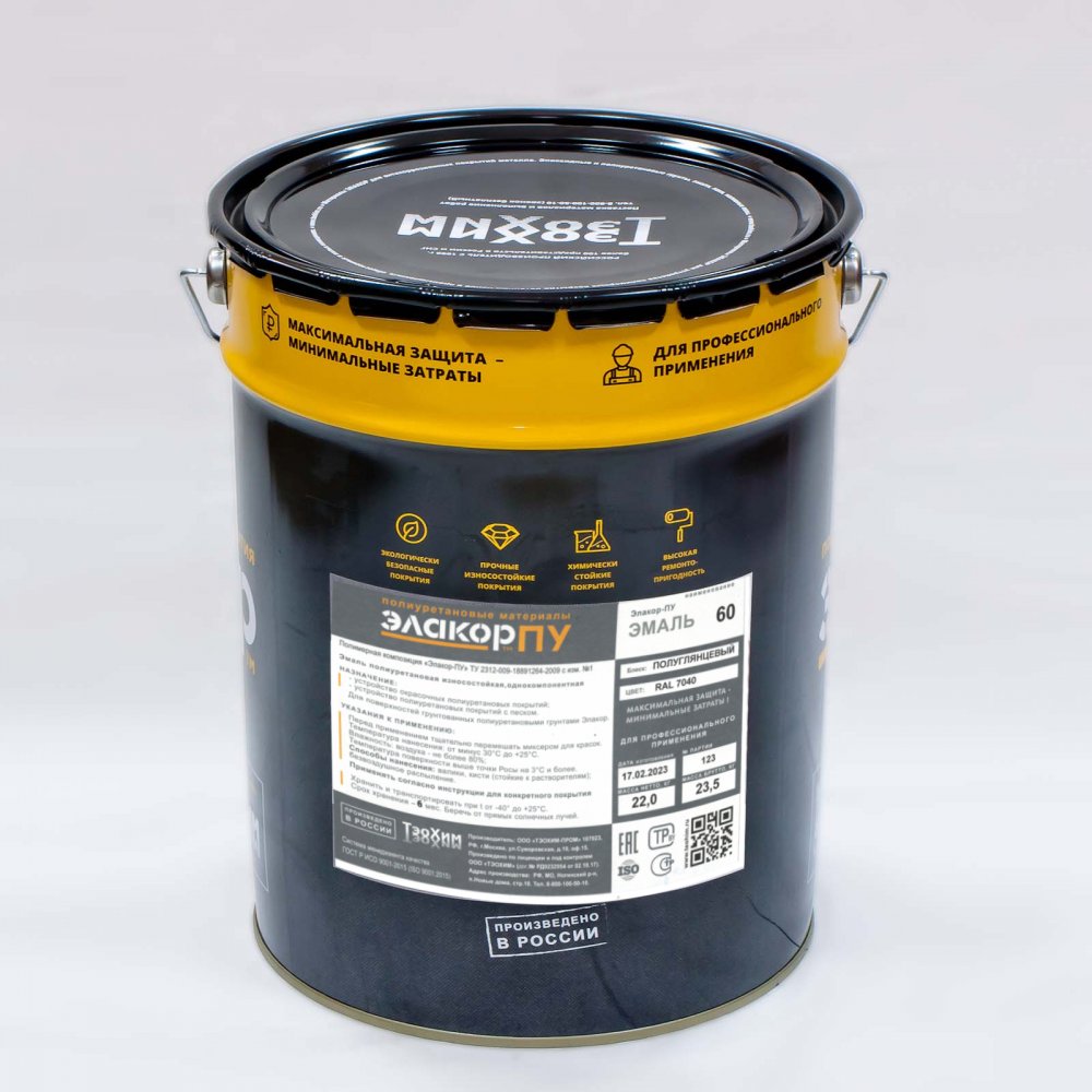 Э"Полиуретановая краска для бетонных полов Элакор-ПУ Эмаль-60 – цветная однокомпонентная влагоотверждаемая полуглянцевая. Важное преимущество: может наноситься при отрицательных температурах (от минус 30°С). После полимеризации образует высокопрочный изно